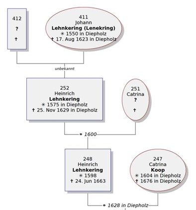 Vorfahren der Familie Lehnkering aus Diepholz Die Familie meines Vaters stammt väterlicherseits in direkter Linie von Heinrich Lehnkering und seiner Frau Catrina ab. Sie waren schon im 16. Jahrhundert in Diepholz (heute in Niedersachsen gelegen) ansässig. Seine Vorfahren verließen später die Moorlandschaft Nord-Westdeutschlands und gründeten Familien in Holland, im Ruhrgebiet oder am linken Niederrhein. Ihre Heimatorte hießen Diepholz, Arnheim, Duisburg, Ruhrort, Oberhausen, Sterkrade, Mülheim an der Ruhr, Neukirchen, Rayen oder Rheurdt. Zum Familiennamen Lehnkering kamen durch Heirat die Namen Vielhaber, Hesselmann, Groweg, Neynhaus, Minhorst, Rehmann und andere mehr. - Geschichte der Familie Lehnkering